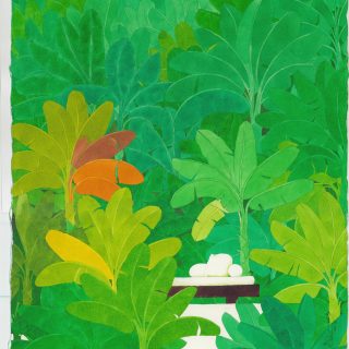 One of Saket’s motifs is the lilies, which he portrays in an alluringly distinctive way each time they make it on his canvas – they are rendered in cheerful vibrancy when he goes for a bold colour palette, or can be more intriguing like when he captures the pitch-dark night beneath the lily pads.